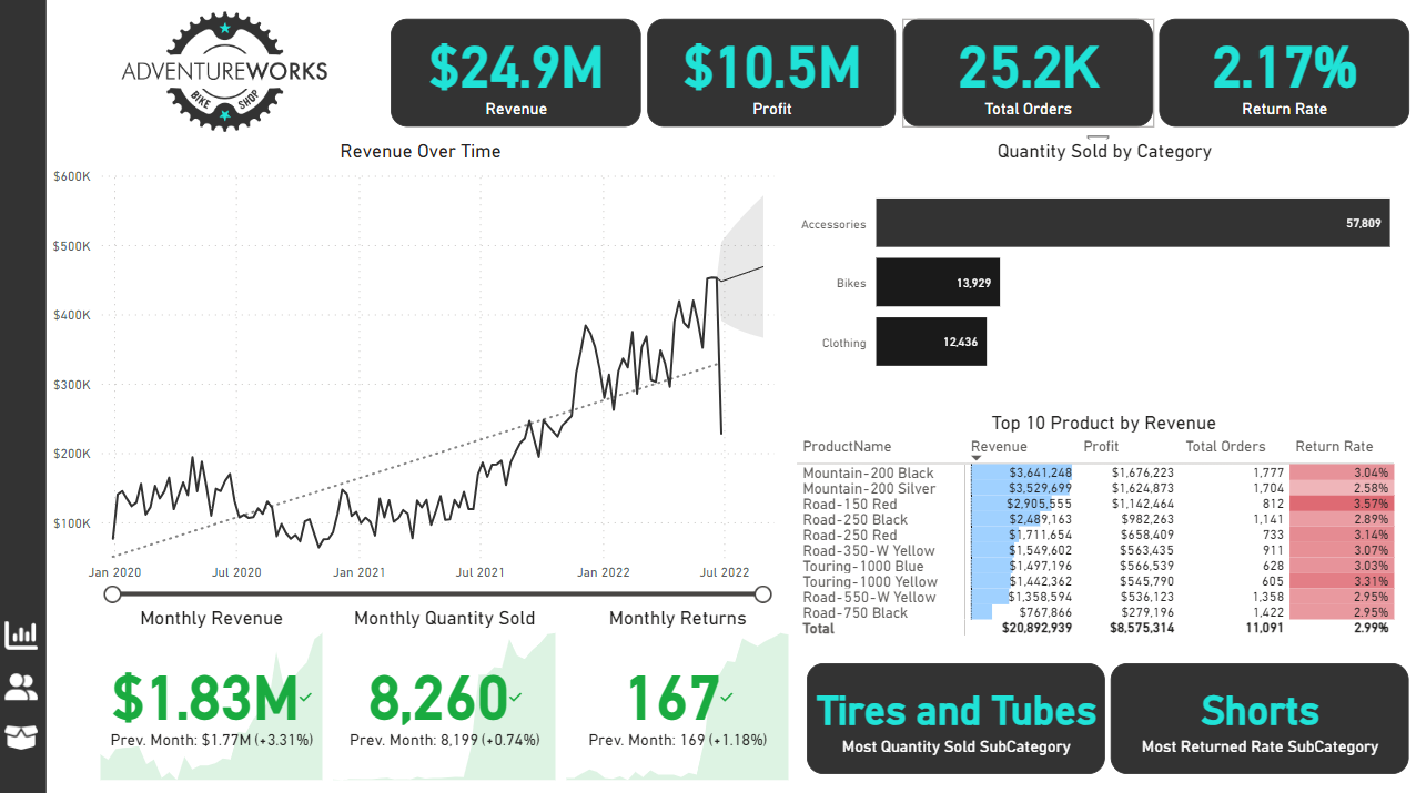 Executive Dashboard: The first report page provides a high-level view of Adventure Works’ overall performance. We used card visuals to present Key Performance Indicators such as overall revenue, profit margins, total orders, and return rates. We also included additional cards to compare current and previous month performances, providing insights into recent trends, a line chart to visualize the trending revenue from 2020-2022 and highlight long-term performance, and presented the number of orders by product category to aid in understanding product sales distribution, and used a further table to display the top 10 products based on key indicators (total orders, revenue, and return rate).